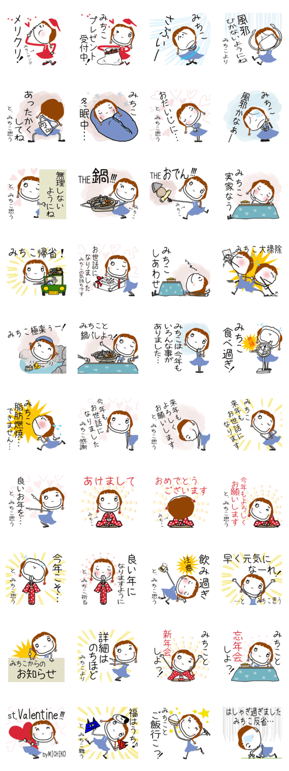| スタンプ説明 | 年末年始に大活躍!クリスマス お正月 バレンタインから節分まで!全国の[ミチコ 美智子 聖子 道子 康子 倫子 理子 法子 美千子 満子 暢子 充子 光知子]さん是非使ってね! |