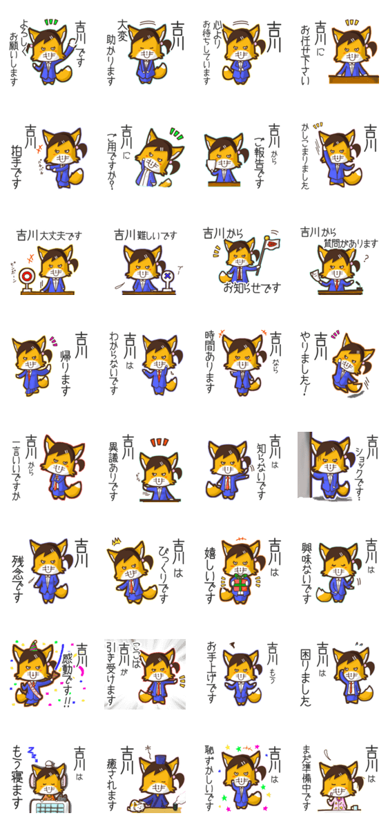 | スタンプ説明 | ゆっけ。が贈る【吉川】用名前スタンプ07です。友達とのやりとり等に。《ゆっけ。のアニぱ!》07「きつねのてんくー姉妹・妹くーこ」です。 |