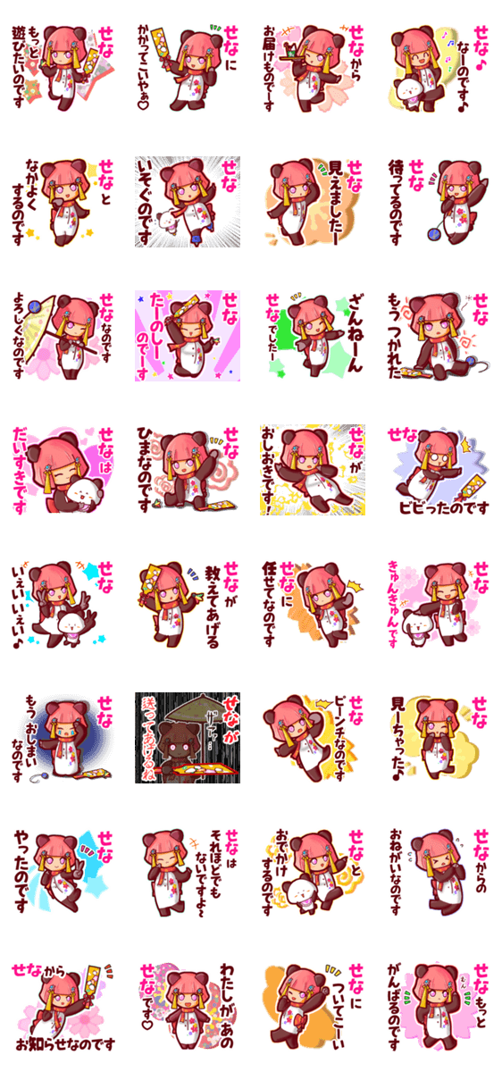 | スタンプ説明 | ゆっけ。が贈る【せな】用名前スタンプ16です。友達や恋人、グループでのやりとりにぜひ。《きぐるみじょし》05「パンダなわらしちゃん」と親友の「甘パン」です。 |