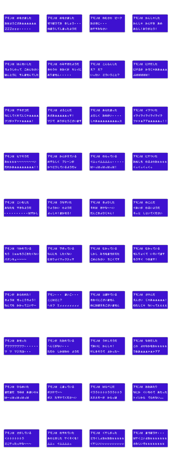 名前、表示名、あだ名が「アモン」を使う方のための、専用ドット文字RPG風のスタンプFです。昭和の懐かしい8ビットRPGリスペクト。