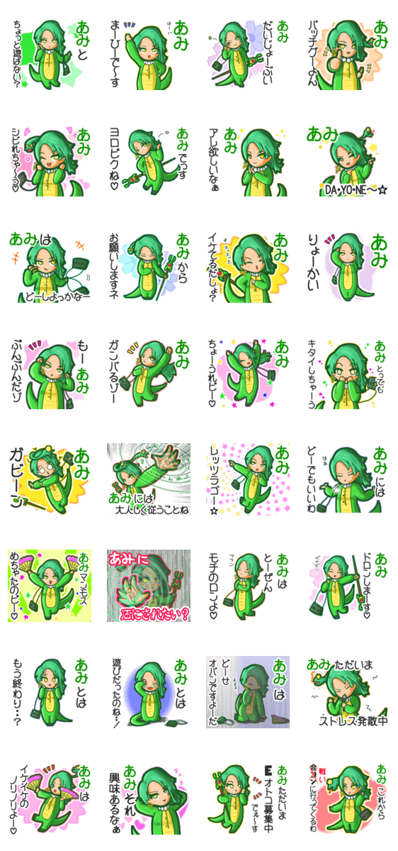 | スタンプ説明 | ゆっけ。が贈る【あみ】用名前スタンプ15です。友達や恋人とのやりとり、グループの連絡にぜひ。《きぐるみじょし》04「バブルなヘビねーさん」のスタンプです。 |