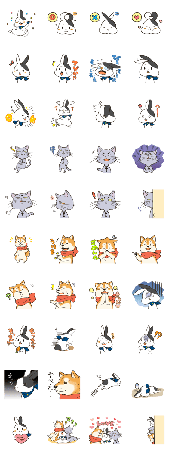 ウサギ、イヌ、ネコのなかよしトリオのスタンプです。会話のお供にどうぞ
