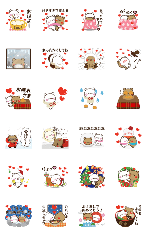 | スタンプ説明 | アモーレ♡くまくま第15弾。お正月、クリスマスなどの年末行事にも使える、冬バージョン。彼氏、彼女、旦那さん、奥さんなど、大好きな人をあっためてあげてね♡ |