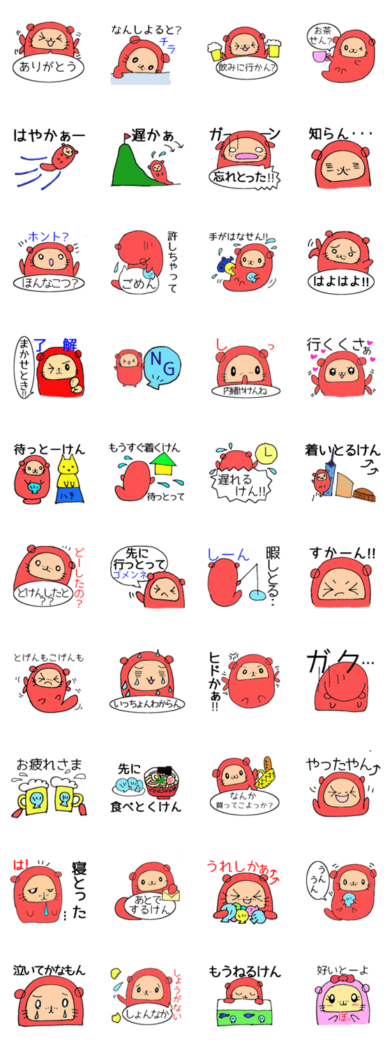 明太子の着ぐるみを着た博多弁を話す可愛いラッコ、明太ラッコちゃんです。日常的に使う言葉を作成。可愛い仲間、辛口の辛子明太ラッコ、恋するタラッコちゃんも登場です