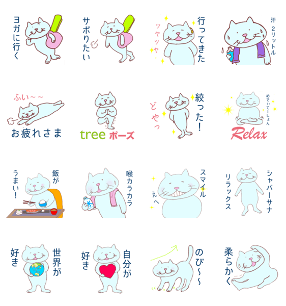 ヨガに行く猫の日常を描いたスタンプ。平和な気分で毎日楽しくできる範囲で頑張る猫を応援しよう。