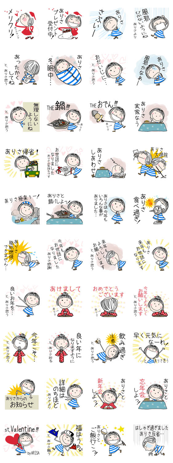 | スタンプ説明 | 年末年始に大活躍!クリスマス お正月 バレンタインから節分まで!全国の[アリサ 有沙 有紗 亜里沙 有彩 亜梨紗 愛里紗 愛咲 有砂 愛紗 亜莉沙 愛里咲]さん是非使ってね! |