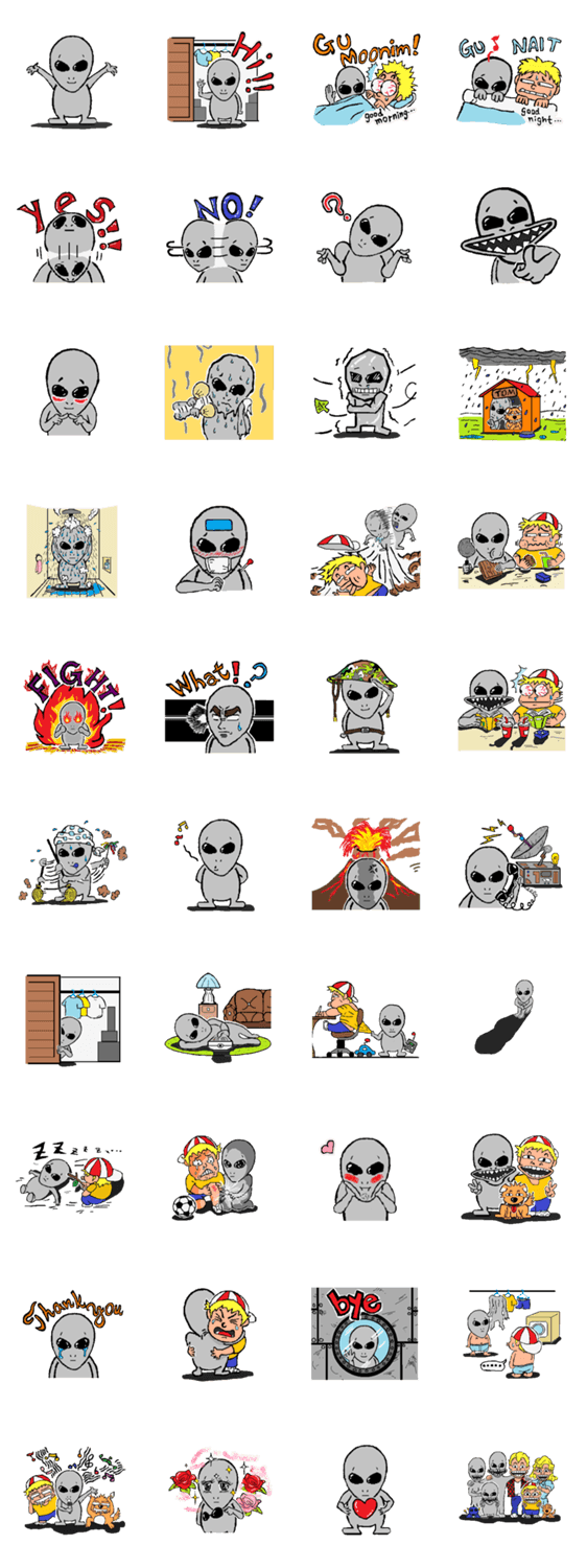 地球で迷子になってしまったエイリアンのジョン君はたまたま出会った地球人の男の子とお迎えが来るまで一緒に暮らしている様子のスタンプです。