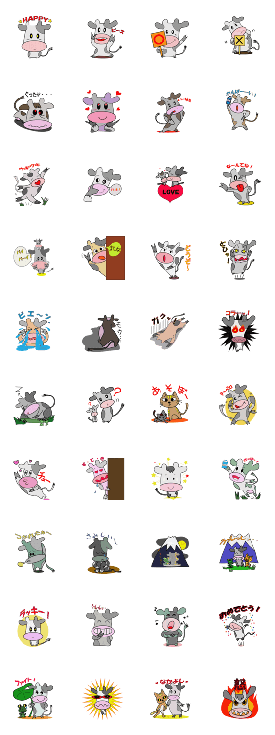 富士山の麓で暮らす牛さんのスタンプです。いろんな表情を楽しんでください