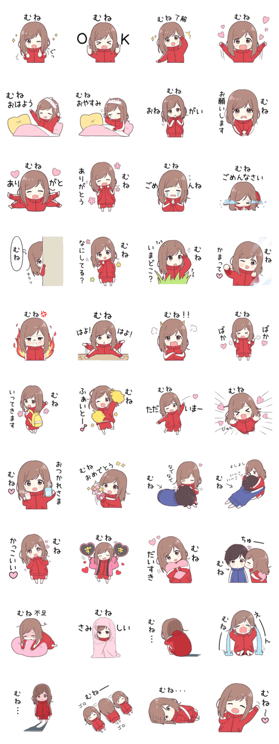 | スタンプ説明 | 【むね】に送る専用のジャージちゃんスタンプ第1弾です。大好きな「むね」に呼びかけます。 |