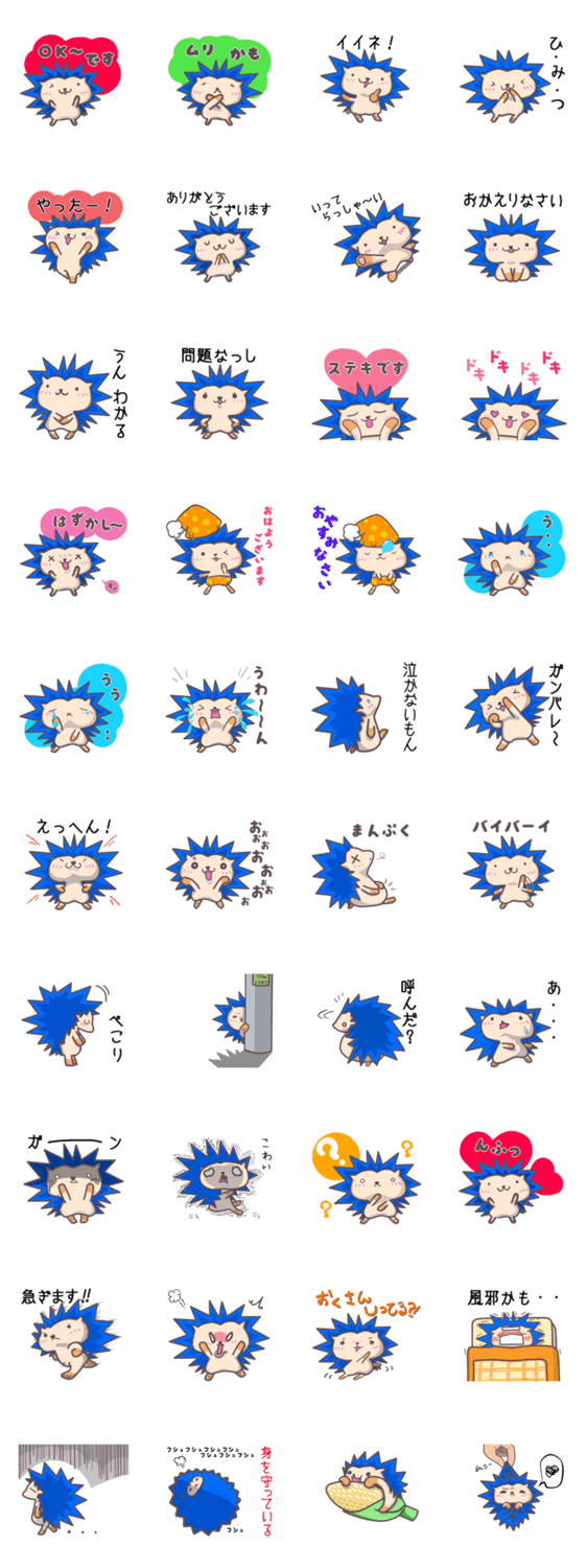 日常会話で使えるスタンプを幸せを呼ぶ?青いハリネズミで作りました。たくさん使ってください。