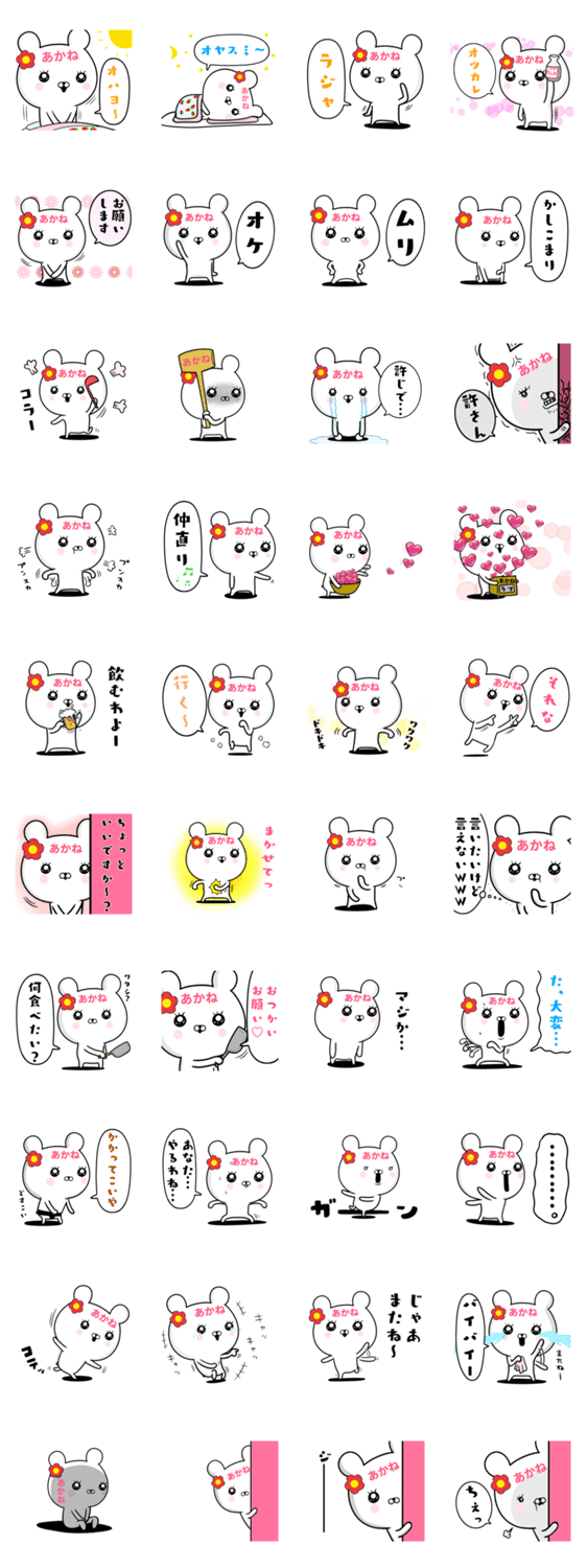 | スタンプ説明 | あかねチャンなら使える,クマの日常会話,あいさつ,連絡♪名前,ネームがアカネ(アカネ,茜,赤根,朱音,明音,亜佳音,朱根,紅音)さんに♡ |