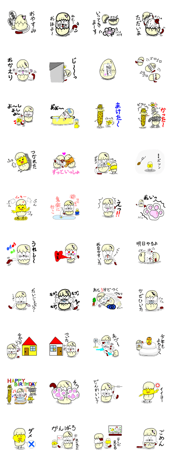 卵のカラが気に入り、それに入って生活しているマイペースなネコとその仲間達のスタンプ