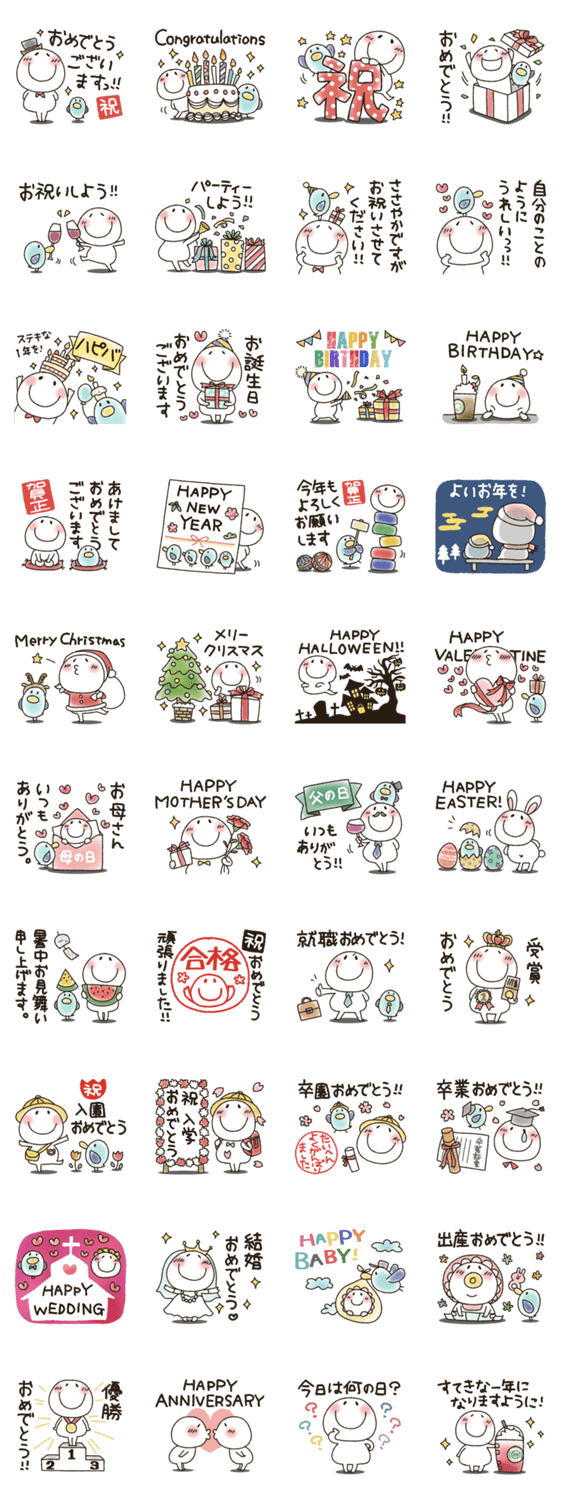 まるぴシリーズ第20弾、おめでとうバージョンです。誕生日、結婚、出産、母の日、クリスマス、お正月、ハロウィン、イースター、入学や卒業まで、イベントに使えます。