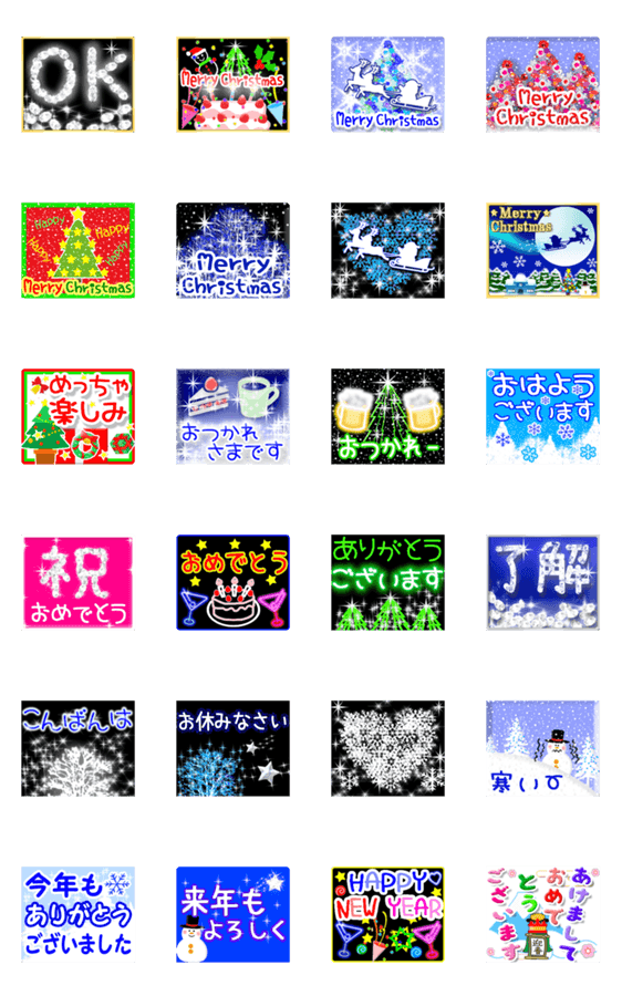 | スタンプ説明 | 動く! 大人のクリスマスを演出するカラフルな光! ☆楽しいクリスマス、年末、お正月、日常語、お祝いに、冬を中心に一年中使えます ☆カウントダウン年賀状も! |