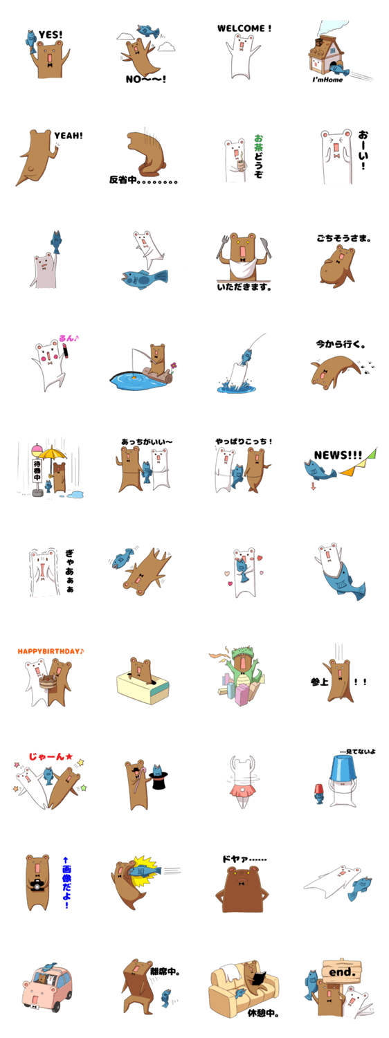 二匹の平らなクマと鮭の癒し系スタンプ第二弾。皆仲良しです。