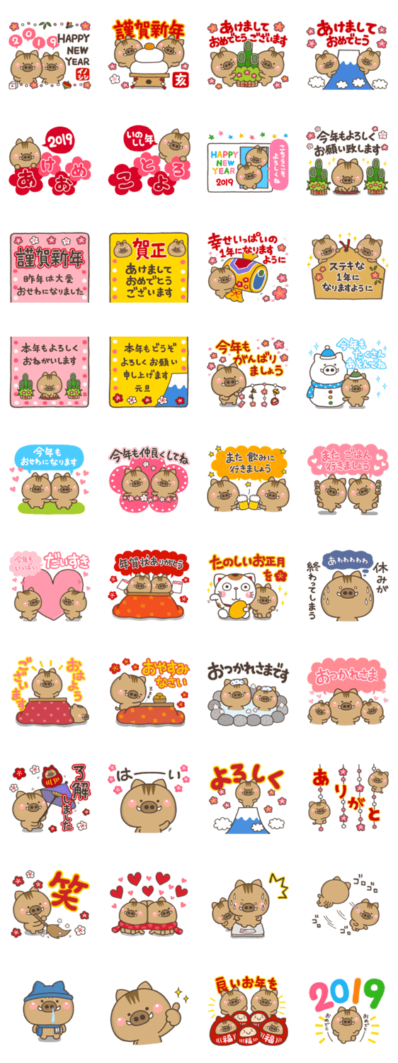 | スタンプ説明 | 2019年の干支・いのししのスタンプです。どなたでも使用できる&送ることが出来る無難なかわいいイラストです。【作:いしいともこ】 |