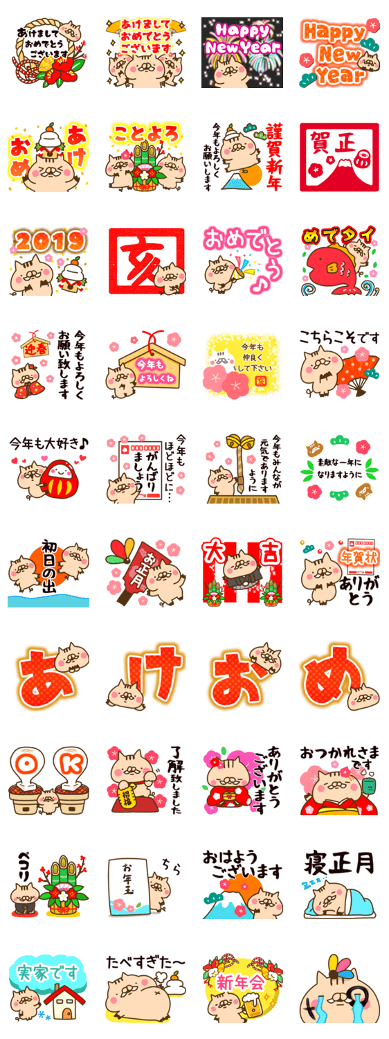 | スタンプ説明 | 2019年お正月(正月)のスタンプ/2019年の干支/いのしし/猪/亥年/お正月を盛り上げます。新年のご挨拶に。あけおめ/年末年始/干支/年賀/専用38名前なし/山田まぽん作 |