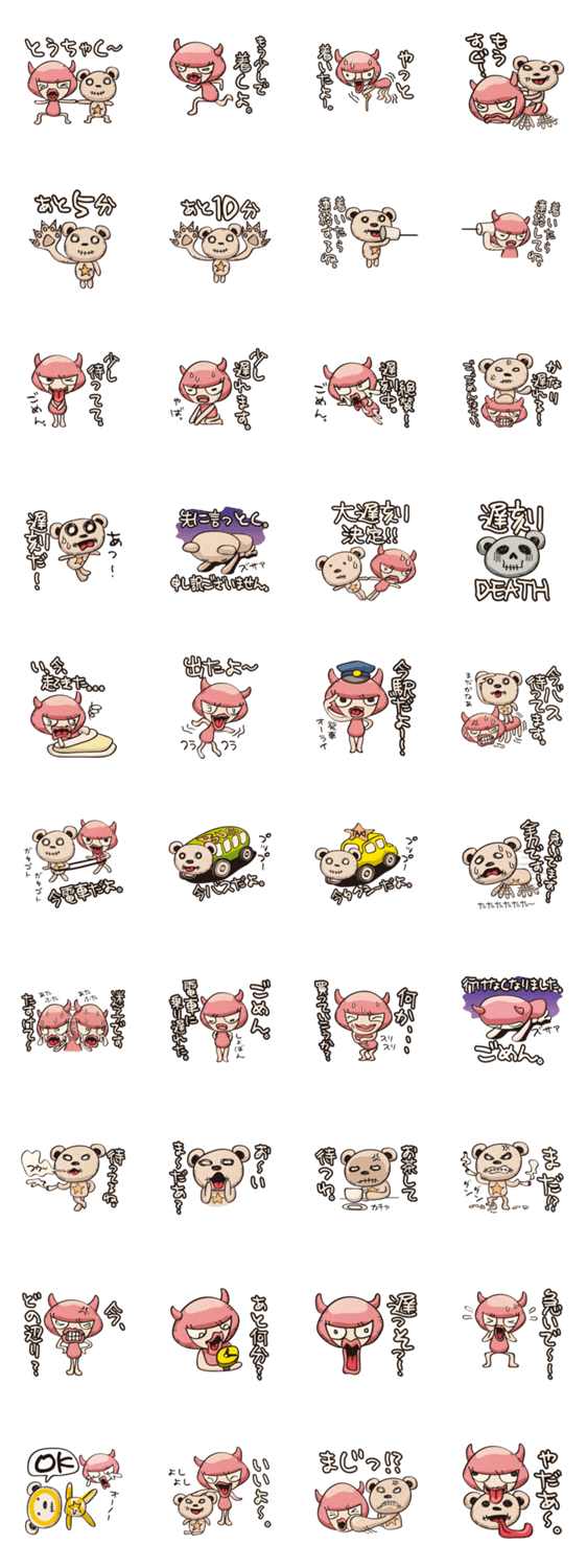 ツノのはえた可愛い女の子とちょっとイジワルなクマのぬいぐるみの「おへん人(お返事をする人)」。キュートな2人が待ち合わせシーンで使えるお返事をしてくれます。