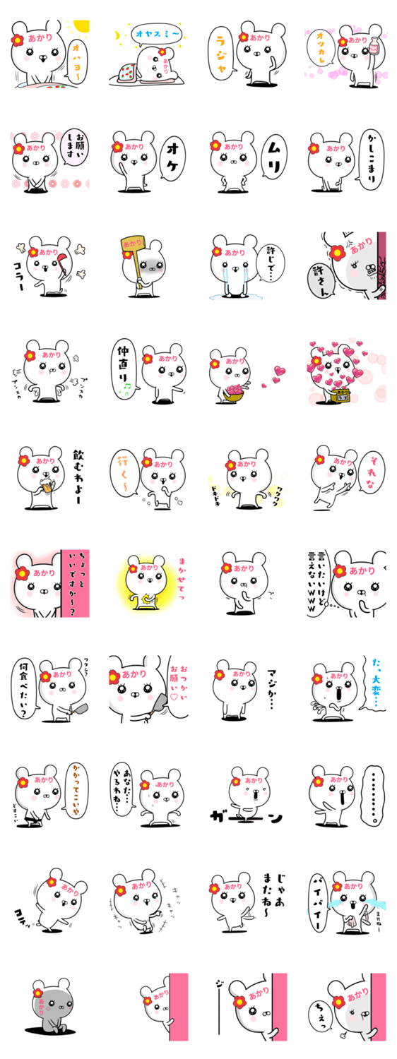 | スタンプ説明 | あかりチャンなら使える,クマの日常会話,あいさつ,連絡♪名前,ネームがアカリ(燈,朱莉,朱里,亜香里,灯里,明里,亜加梨,安佳里,赤理,明莉,小明,朱理,明香里,有加里)さんに♡ |