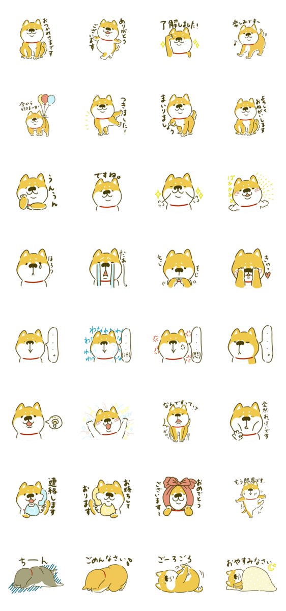 柴の子犬のゆるっと敬語スタンプ。目上の人にも親しい人にも。硬すぎず、ゆるすぎず。肩の力が少し抜けるスタンプです。