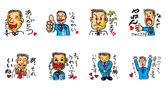 全国の「かわさきさん」を応援するスタンプです。頑張るおじさんが日々の暮らしの中でポジティブに生き、皆さんに元気を与えます。