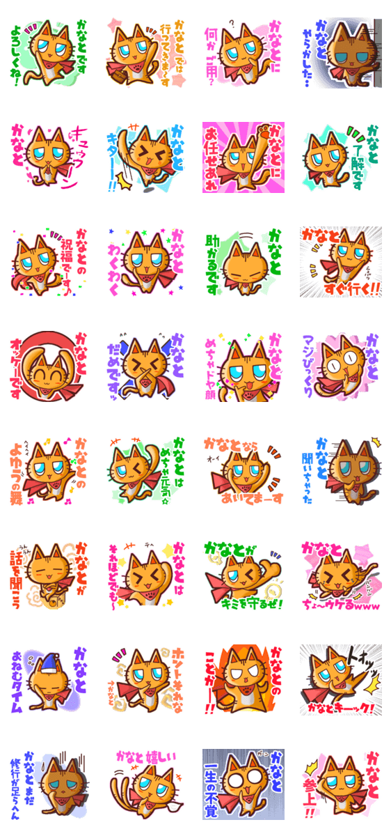 | スタンプ説明 | ゆっけ。が贈る【かなと】用名前スタンプ01です。友達や恋人、グループのやりとりにぜひ。《ゆっけ。のアニぱ!》01「ヒーローになりたいねこ」のスタンプです。 |