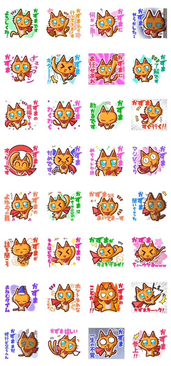 | スタンプ説明 | ゆっけ。が贈る【かずま】用名前スタンプ01です。友達や恋人、グループのやりとりにぜひ。《ゆっけ。のアニぱ!》01「ヒーローになりたいねこ」のスタンプです。 |