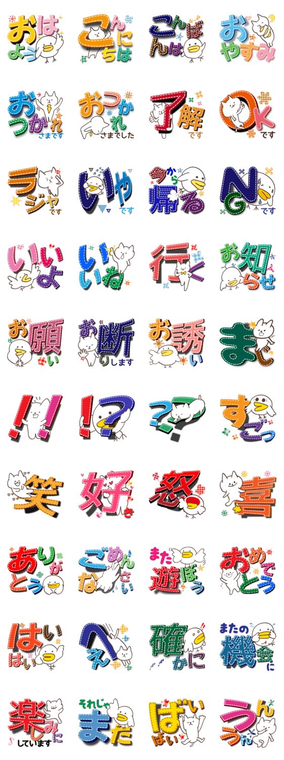 スタンプを選ぶ時にとにかく選びやすい「でか文字」スタンプ!スティッチされたカラフルな文字にネコとヒヨコがゆるい雰囲気をプラスしてます。