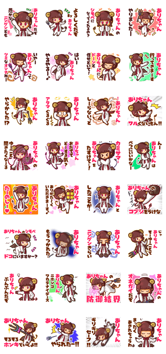 | スタンプ説明 | ゆっけ。が贈る【ありちゃん】用名前スタンプ14です。友達や恋人とのやりとり、グループの連絡にぜひ。《きぐるみじょし》03「デビルなしーちゃん」です。 |