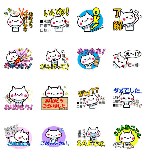 | スタンプ説明 | LINEスタンプにGCPやヘルシンキ宣言が登場!?CROや製薬会社の治験モニターCRAにまつわる小ネタ満載スタンプ。IRB、SAE、ICF、CRCまで登場!FDAやPMDA査察官の方もどうぞ! |