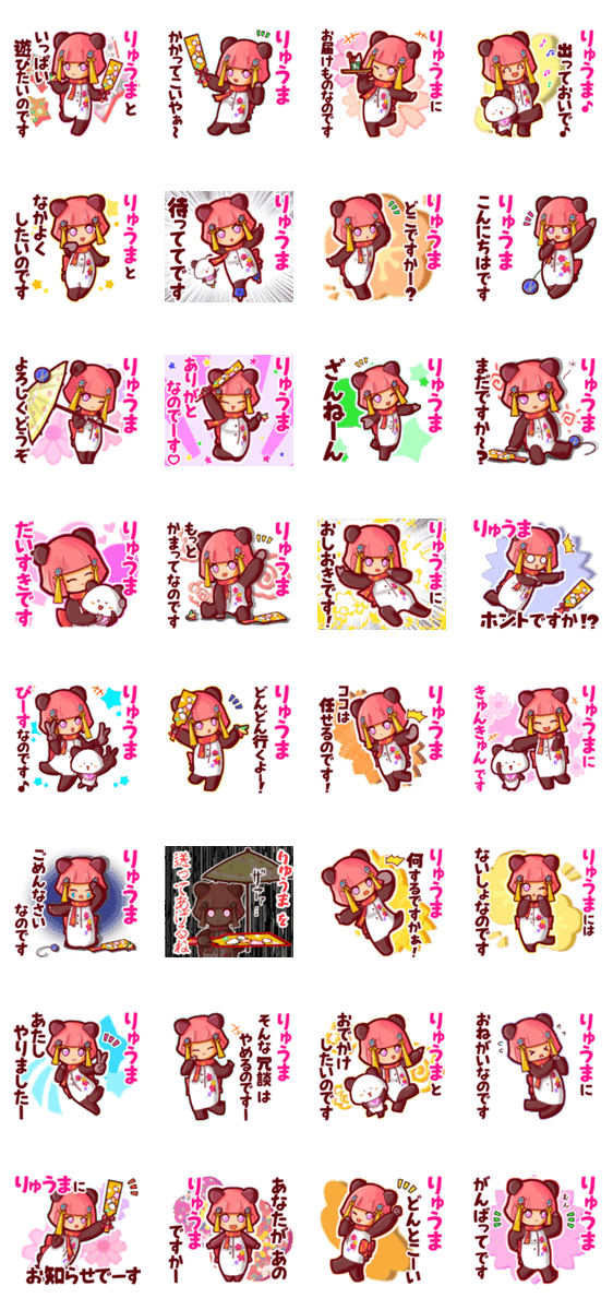 | スタンプ説明 | ゆっけ。が贈る【りゅうま】に『送る用』名前スタンプ32です。友達や恋人とのやりとりにぜひ。《きぐるみじょし》05「パンダなわらしちゃん」と親友の「甘パン」です。 |