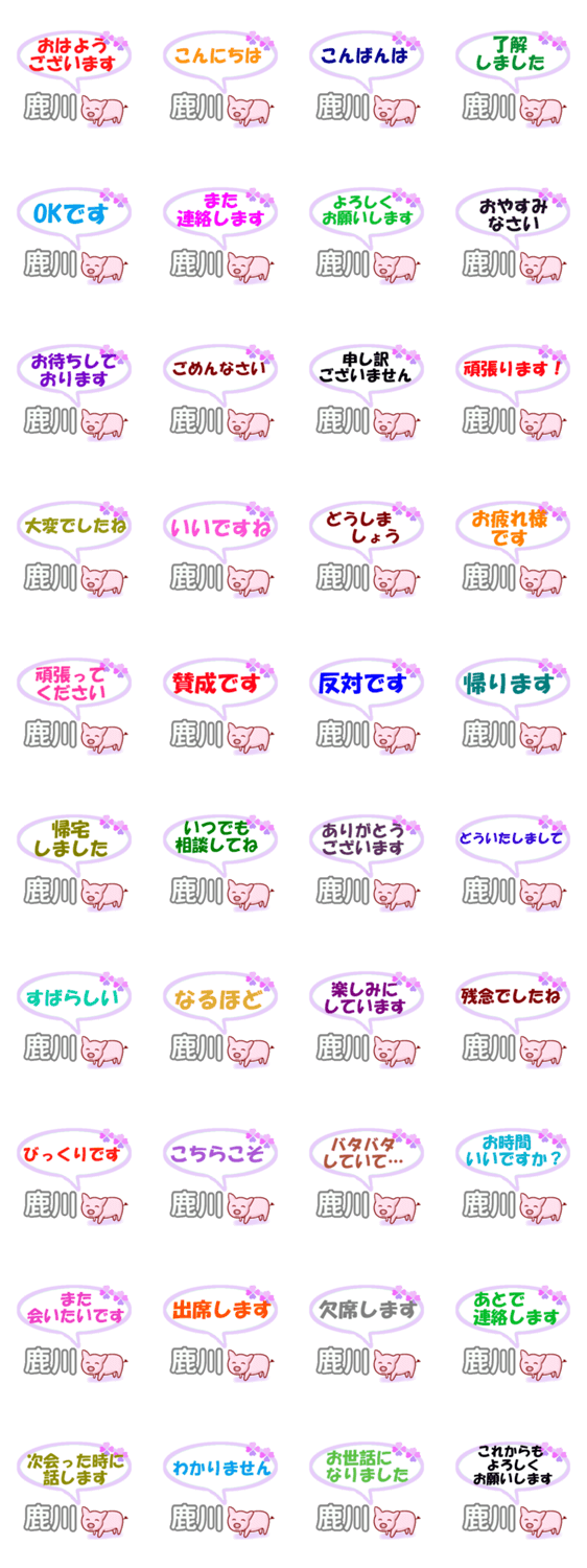 鹿川「かのかわ」さん専用。おはようございます、了解、出席、欠席、賛成、反対など大人の丁寧な日常会話、連絡用にどうぞ