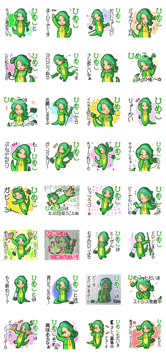 | スタンプ説明 | ゆっけ。が贈る【ひめこ】用名前スタンプ15です。友達や恋人とのやりとり、グループの連絡にぜひ。《きぐるみじょし》04「バブルなヘビねーさん」のスタンプです。 |