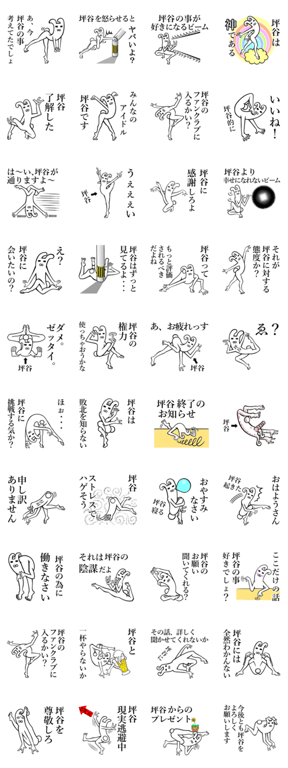 | スタンプ説明 | 名前が【坪谷/つぼや】スタンプ。坪谷/ツボヤ/つぼちゃん/ツボチャン/坪谷君/つぼたにくん/ツボタニクン/さぼたに/サボタニ/つぼっち/ツボッチつぼりん/つぼしー/子猫旅館 |