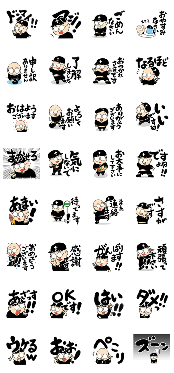 メタボでツルツル頭のおじさんスタンプ。十字架の黒帽子に丸メガネ、太って、おデブさん。おちゃめで、かわいいおじさんです。ロック好きの方にもぜひ。