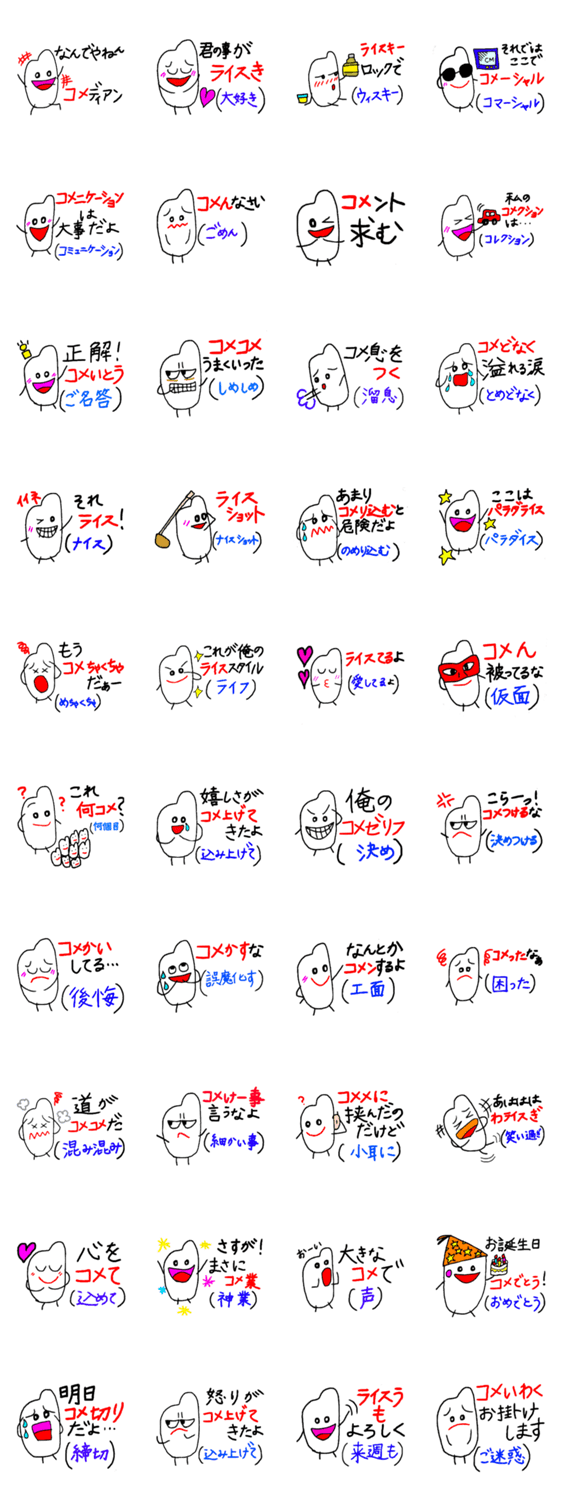 お米のコメディアンスタンプです。日常生活で使う言葉などをダジャレてくれています。変わったスタンプお探しの方はいかがですか?