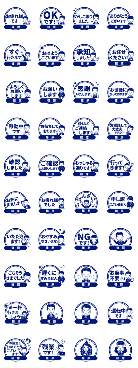 | スタンプ説明 | 篠原/しのはら様専用!ビジネスマン、サラリーマンの会社仕事にOK!職場、オフィス業務他、大人のマナー丁寧敬語でもOK。印鑑/はんこ/ハンコ/判子/名字/名前入り/スタンプ |