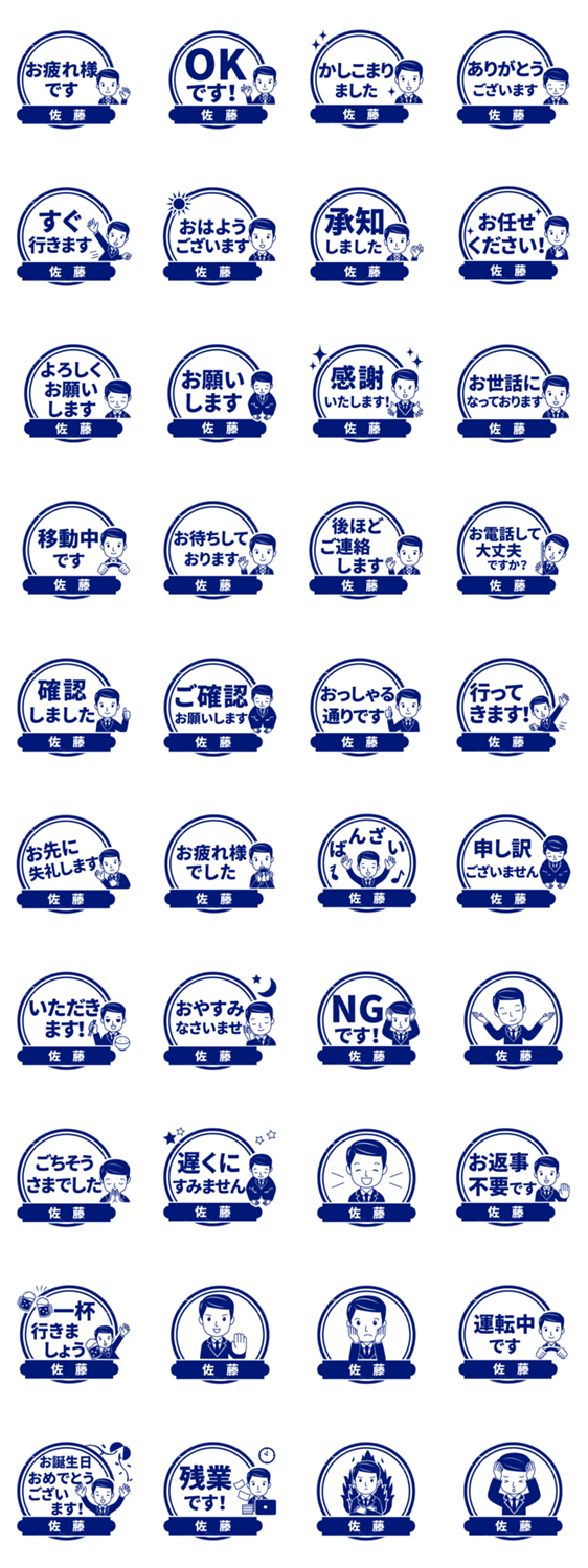 | スタンプ説明 | 佐藤/さとう様専用!ビジネスマン、サラリーマンの会社仕事にOK!職場、オフィス業務他、大人のマナー丁寧敬語でもOK。印鑑/はんこ/ハンコ/判子/名字/名前入り/スタンプ |