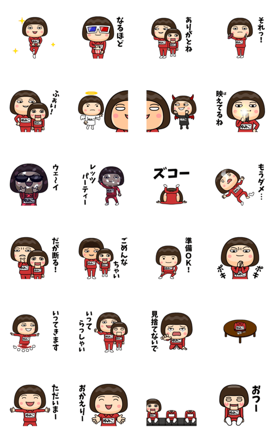 ゆみこが使う芋ジャージの名前スタンプ第6弾!クスっと笑えるような小ネタが満載♪相手に伝えにくい言葉は、初登場の腹話術人形リトル・ユミコに代弁してもらおう!