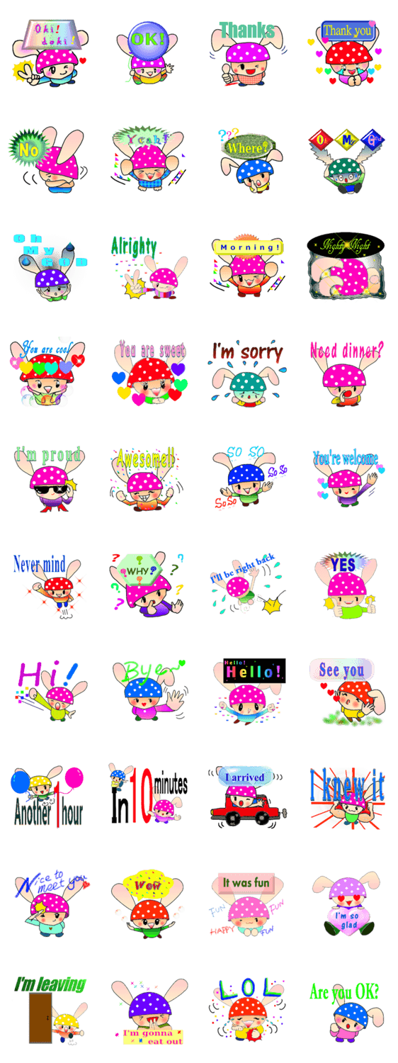| スタンプ説明 | A rabbit wearing a colorful mushroom hat!!!You can talk to your friends and family only by sending these stamp!!!Her name is "Yukkinoko" |