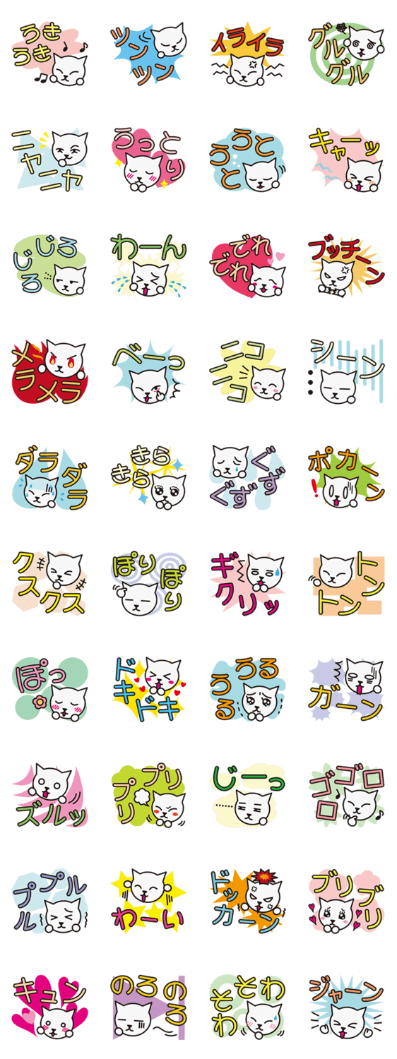 ホワイトキャットの擬声語スタンプ!表情豊かなネコとカラフルなオノマトペであなたの気持ちを伝えよう!