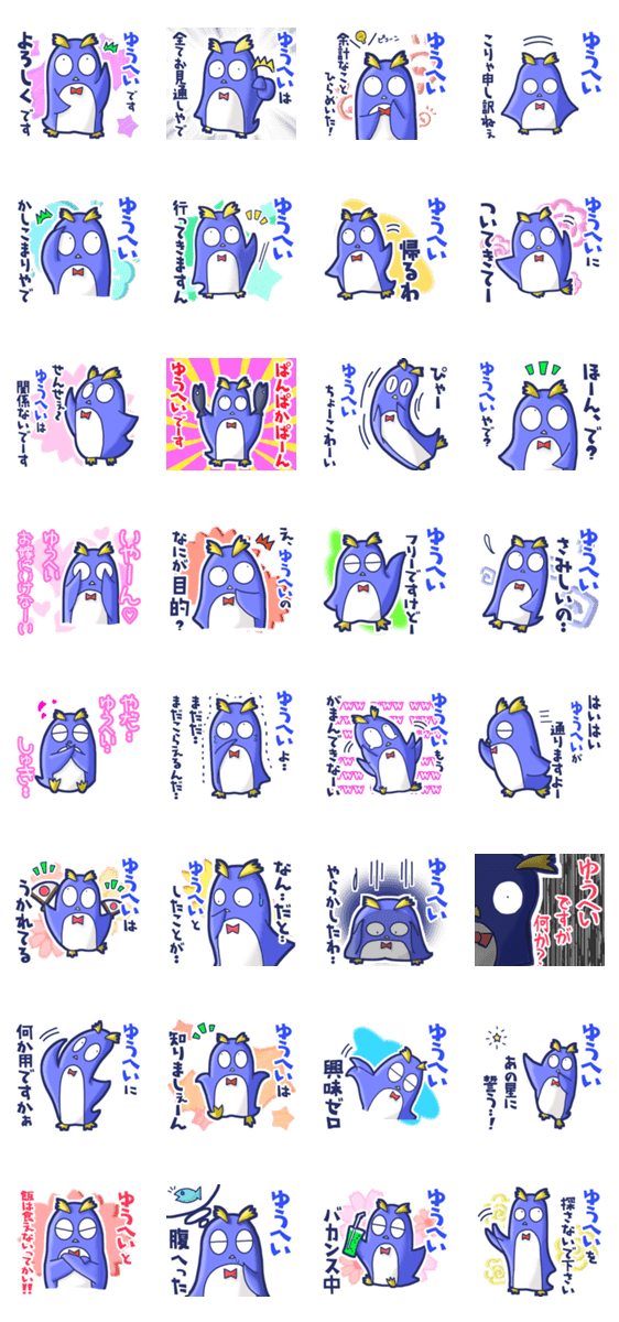 | スタンプ説明 | ゆっけ。が贈る【ゆうへい】用名前スタンプ05です。友達や恋人とのやりとり、グループの連絡にぜひ。《ゆっけ。のアニぱ!》05「てきとーなペンギン」のスタンプです。 |