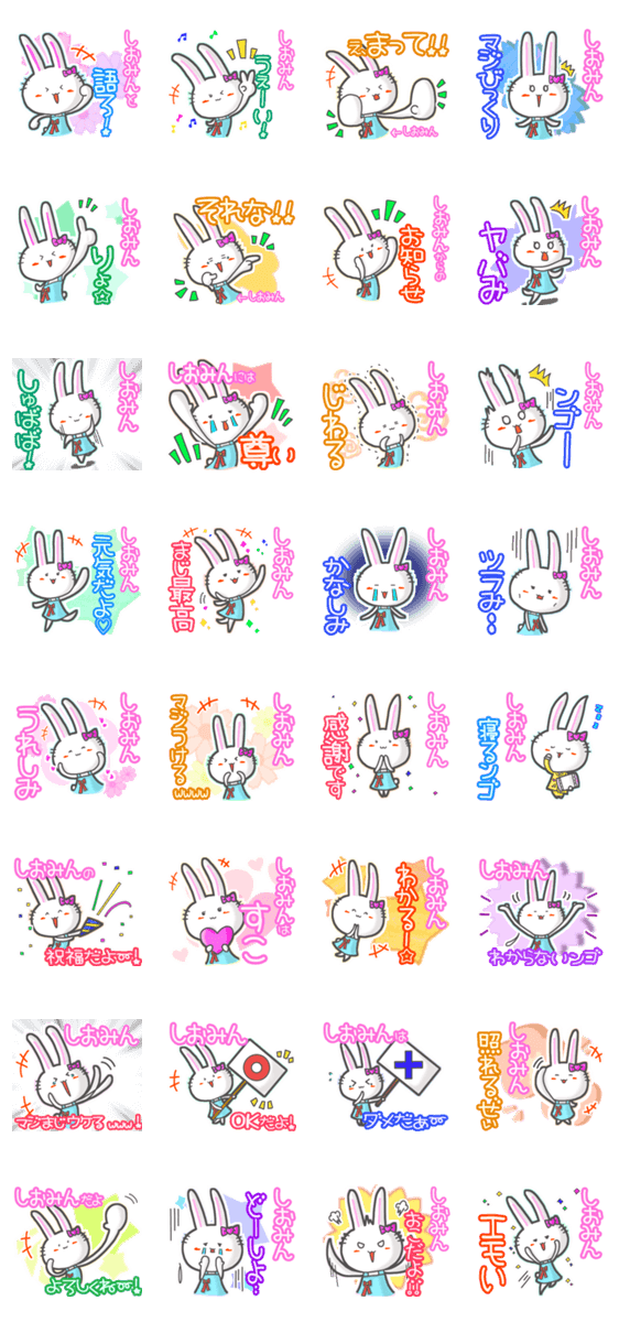 | スタンプ説明 | ゆっけ。が贈る【しおみん】用名前スタンプ04です。友達や恋人とのやりとり、グループの連絡にぜひ。《ゆっけ。のアニぱ!》04「ガールなうさぎちゃん」です。 |