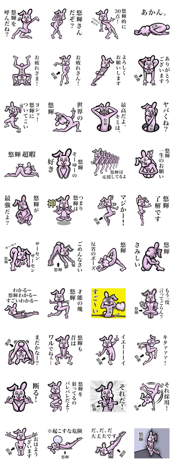 | スタンプ説明 | 名前が【悠輝】さんスタンプ。悠輝/ゆうき/ユウキ/はるき/ハルキ/ゆうちゃん/ユウチャン/悠輝君/ゆきくん/ユキクン/ゆうっち/ユウッチ/はるりん/ハルリン/なぽろあ |