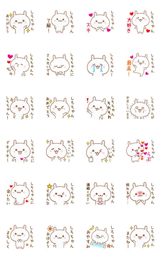ともだち、家族、恋人など、大切な「しろちゃん」へ送る、動くウサギの名前スタンプです。しろ/シロ/白/城/shiro