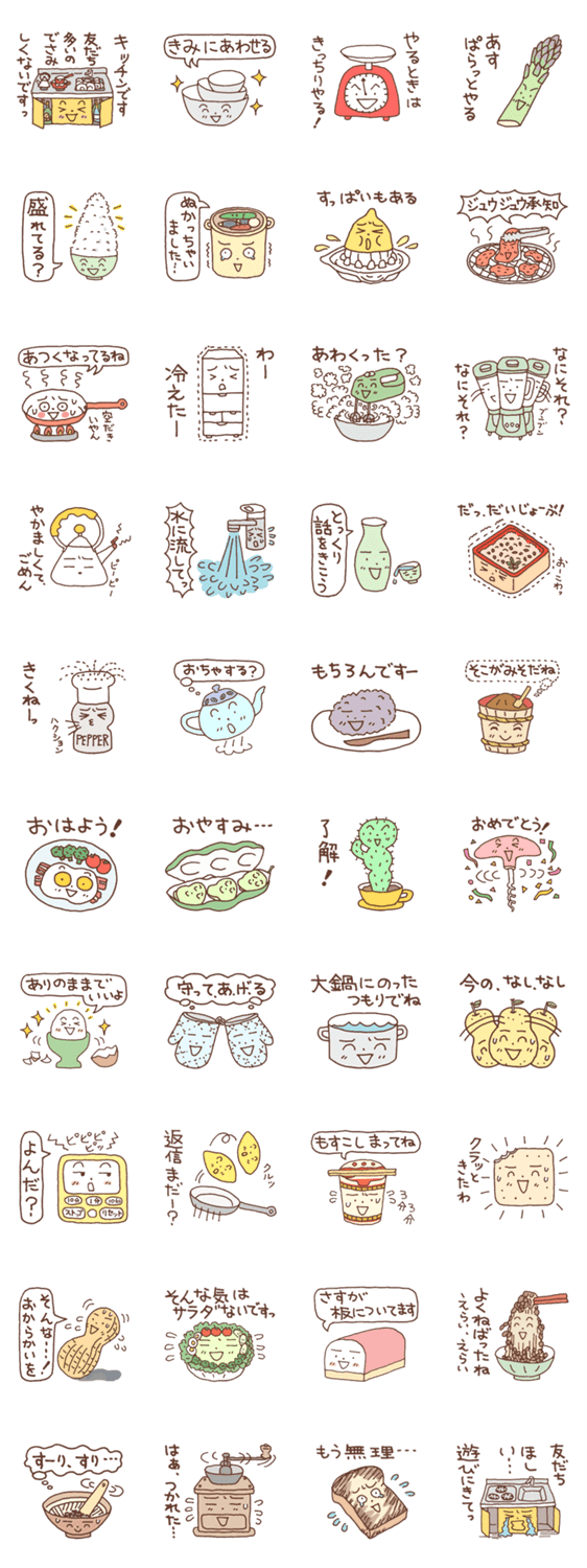 キッチン小物や食べ物など、キッチンのいろいろな物の日常会話のスタンプです。