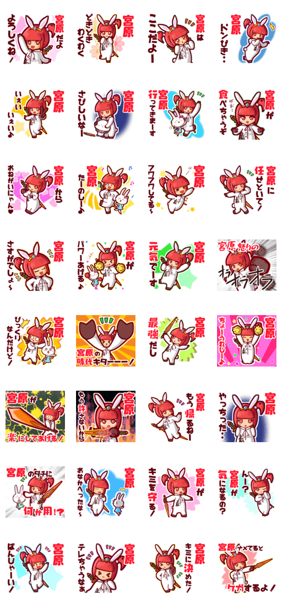 | スタンプ説明 | ゆっけ。が贈る【宮原】用名前スタンプ12です。友達や恋人、グループでのやりとりにぜひ。《きぐるみじょし》01「うさぎなミコちゃん」と親友の「ガルうさ」です。 |