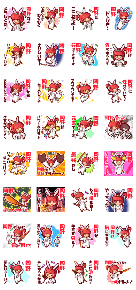 | スタンプ説明 | ゆっけ。が贈る【岡野】用名前スタンプ12です。友達や恋人、グループでのやりとりにぜひ。《きぐるみじょし》01「うさぎなミコちゃん」と親友の「ガルうさ」です。 |