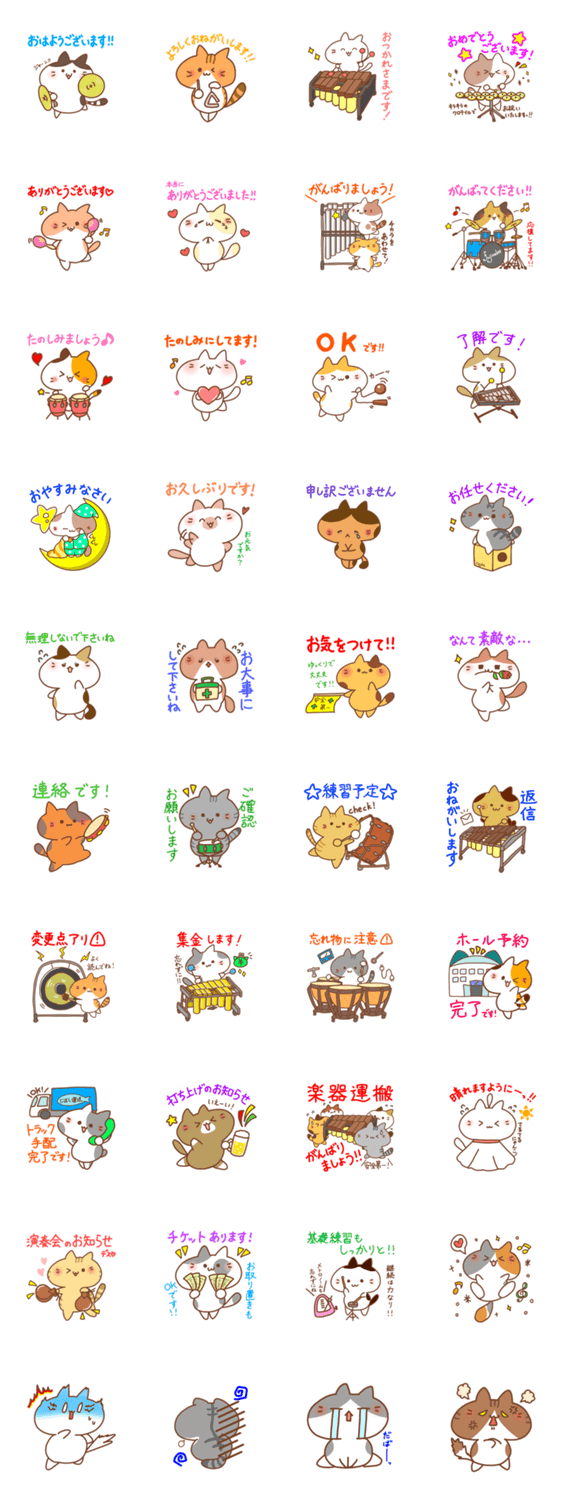 打楽器がお好きな方へ。「ふじねこ」たちのパーカッションスタンプです。