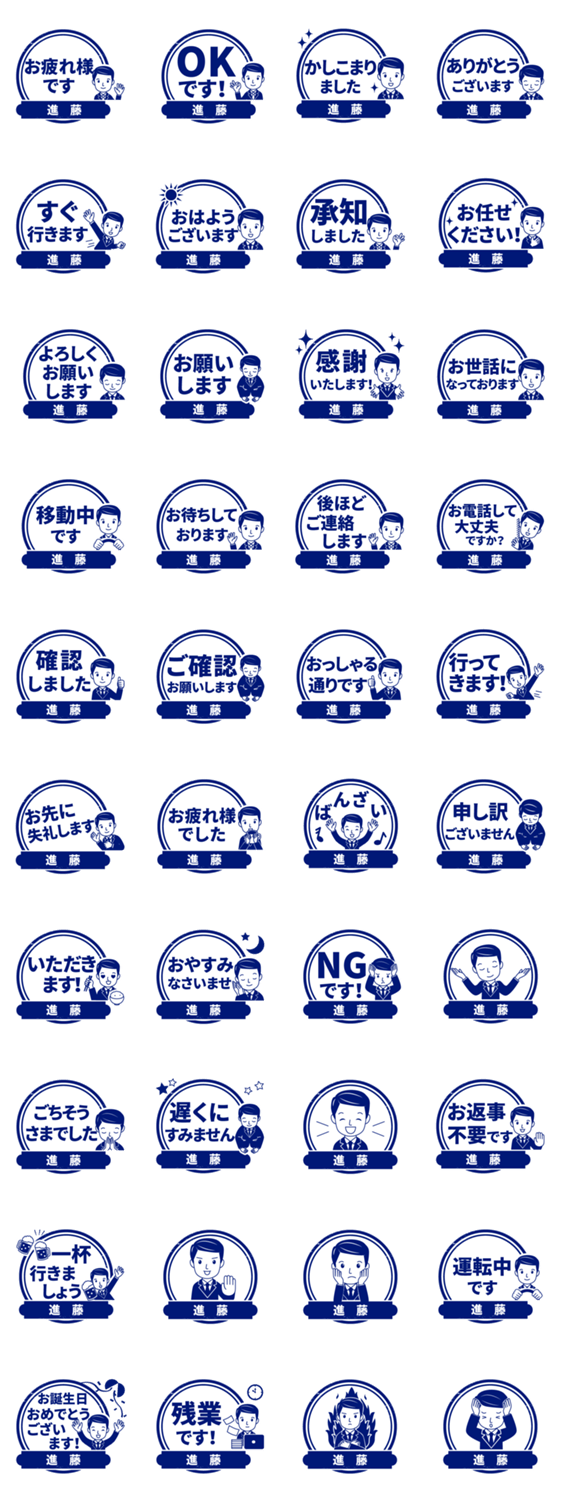 | スタンプ説明 | 進藤/しんどう様専用!ビジネスマン、サラリーマンの会社仕事にOK!職場、オフィス業務他、大人のマナー丁寧敬語でもOK。印鑑/はんこ/ハンコ/判子/名字/名前入り/スタンプ |